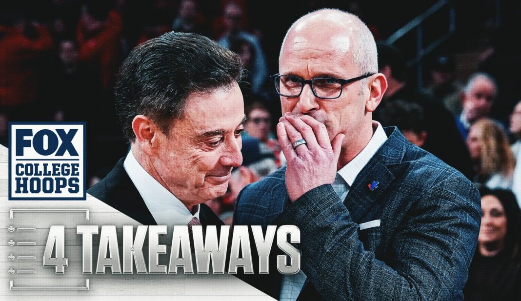 By then, Pitino had long since waved the white flag in a game that arrived with so much hype — that’s always the case when these two heavyweights do battle in the Big East’s modern era — and ended with a historic whimper. In pummeling and pounding the Red Storm to this degree, 72-40, the Huskies became the first program since Virginia on March 5, 2016, to limit a Pitino-coached team to fewer than 50 points, according to FOX Sports Research.